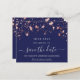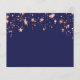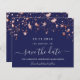A girly and trendy Save the Date for a Quinceañera, 15th birthday party. A navy blue background with rose gold stars. The text: Save the Date is written with a large trendy hand lettered style script. Light grey coloured letters.