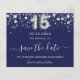 A girly and trendy Save the Date card for a Quinceañera, 15th birthday party. A navy blue coloured background. Decorated with faux silver stars. The text: Save the Date is written with a large trendy hand lettered style script. Number 15 is written with a balloon style font.