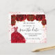 A girly and trendy Save the Date card for a Quinceañera, 15th birthday party. A white background decorated red roses, red faux glitter sparkles and a red dress. Personalize and add a date and name/age. The text: Save the Date is written with a large trendy hand lettered style script.