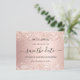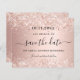 A Save the Date card for a Quinceañera, 15th birthday party. A rose gold metallic looking background decorated with faux glitter dust. Personalize and add a date and name/age. The text: Save the Date is written with a large trendy hand lettered style script with swashes.