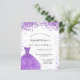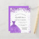 A modern, stylish and glamourous invitation for a Quinceañera, 15th birthday party. On the front: A white background with violet, lilac sparkles, a violet dress. The name is written with a modern hand lettered style script. Personalize and add your party details.