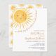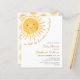 This cute budget baby shower invitation features the text "Our little ray of sunshine is almost here!" with a watercolor smiling yellow sun and a sun pattern on the back.