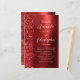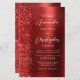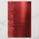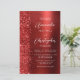 The left-hand edge of this elegant modern wedding invitation features a red faux glitter border. The customizable text combines white handwriting, copperplate and italic fonts on a red faux brushed metal background. The reverse side features a matching glitter and brushed metal design.