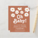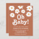 This budget floral baby shower invitation is decorated with daisies and stylish retro typography on a terracotta background.