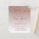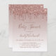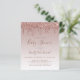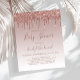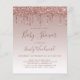 This trendy baby shower invitation features a border of sparkly dripping rose gold faux glitter on an ombre rose gold background. The words "Baby Shower" and the name of the mom-to-be appear in dark rose handwriting script, with the remaining text in dark rose sans serif font.