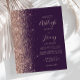 The left-hand edge of this elegant modern wedding invitation features a rose gold faux glitter border. The customizable text combines pale rose gold blush colored handwriting, copperplate and italic fonts on a dark purple background. The reverse side features a matching purple and rose gold design. NOTE: Envelopes are not automatically included with these budget invitations, so please remember to choose the "blank white envelopes" option!