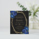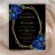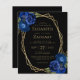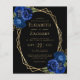 This design features a gold geometric frame decorated with royal blue watercolor floral bouquets and greenery, surrounding gold-coloured text on a black background. The back of the card is solid black.