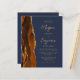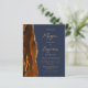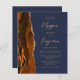 The left-hand edge of this elegant modern wedding invitation features a burnt orange watercolor agate border trimmed with faux gold glitter. The customizable text combines gold-coloured script and sans serif fonts on a dark navy blue background. The reverse side provides spaces for 4 photos (1 square, 2 horizontal, 1 long vertical) and room for your wedding website URL or other information.