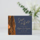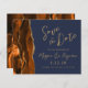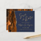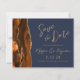 This elegant budget save the date card features a burnt orange and rust watercolor agate border trimmed with faux gold glitter. The customizable text combines gold-coloured handwriting script and sans serif fonts on a navy blue background. The reverse side features a matching burnt orange and gold agate design.