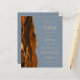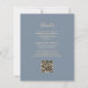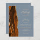 Save the cost of printing and mailing separate RSVP cards with this elegant modern all-in-one budget wedding invitation. The left-hand edge features a burnt orange and rust watercolor agate border trimmed with gold faux glitter. The customizable text combines pale gold-coloured handwriting, copperplate and italic fonts on a dusty blue background. The reverse side provides space for wedding details on a solid dusty blue background, along with a QR code guests can scan to visit your website and RSVP.
