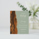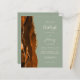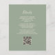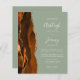 Save the cost of printing and mailing separate RSVP cards with this elegant modern all-in-one budget wedding invitation. The left-hand edge features a burnt orange and rust watercolor agate border trimmed with gold faux glitter. The customizable text combines ivory handwriting, copperplate and italic fonts on a sage green background. The reverse side provides space for wedding details on a solid sage green background, along with a QR code guests can scan to visit your website and RSVP.