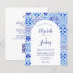 This rustic design features a background pattern of blue and white watercolor Portuguese tiles, or azulejos. Personalize it with the names of the bride and groom in blue calligraphy script and the remaining text in a combination of sans serif, copperplate and italics on a white arch shape. The reverse side provides space for wedding details on a solid white background, along with a QR code guests can scan to visit your website and RSVP, which saves the cost of printing and mailing separate RSVP cards.