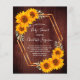 A rustic brown wooden barn wall background. A faux gold geometric frame. With the text: Baby Shower and the name of the mother on front written with a modern hand lettered style script. White letters.