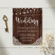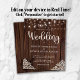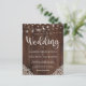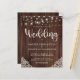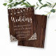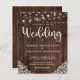 Budget Rustic Wood and String Lights Lace Wedding Invitations featuring a rustic wood background with twinkling strings of lights and vintage style lace in the bottom corners. The word wedding is set off in elegant yet rustic typography, making this the perfect design for your boho or country wedding.