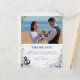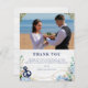 Budget photo mariage carte de remerciements. Conception de mariage rustique de plage combinant éléments nautiques (ancre marine, noeud, étoile de mer et bois blanchi) avec de beaux bouquets floraux d'hydrangée bleue, fleurs d'anémones blanches et rousses, feuilles d'eucalyptus, dahlia et verdure. Idéal pour mariage à la plage, mariage nautique, mariage de destination, mariage d'été.