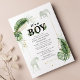 Wild forest themed giraffe, and elegant boys safari animal baby shower invitation featuring a giraffe, an elephant, gold foil and green leaves. Perfect for a boy's baby shower invitations