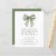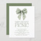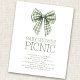 Budget Sage Gingham Bow Baby Shower Picnic. A budget priced smaller 4.5 x 5.6” alternative on a 110lbs semi-gloss which is similar in thickness to a postcard. There is ONE per sheet. A modern coquette bow design for your baby shower picnic. Easily personalise the text as required and change the text and background colours if you wish via the edit further option. With an illustration of a sage coquette gingham bow.