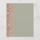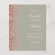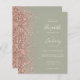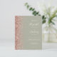 The left-hand edge of this elegant modern wedding invitation features a rose gold faux glitter border. The customizable text combines ivory handwriting, copperplate and italic fonts on a sage green background. The reverse side features a matching sage green and rose gold design.