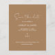 Chic script photo save the date flyer with your names, wedding date, location and wedding website in white elegant handwritten script calligraphy and modern typography on a gold caramel background. Simply add your personal details and favourite photo! Exclusively designed for you by Happy Dolphin Studio. If you need any help or matching products, please contact us through our store chat. We're happy to help you make your wedding the most beautiful day!