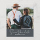 Chic script photo save the date flyer with your names, wedding date, location and wedding website in white elegant handwritten script calligraphy and modern typography on an off-black background. Simply add your personal details and favourite photo! Exclusively designed for you by Happy Dolphin Studio. If you need any help or matching products, please contact us through our store chat. We're happy to help you make your wedding the most beautiful day!