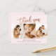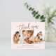 This modern 3 photo thank you note features rose gold handwritten script thank you and birth details on the front. The back includes a personal message from the entire family. Click the edit button to customize this design with your photos and details.