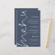 Budget Script Dusty Navy Blue Wedding Menu. A budget price size 5.5” x 8.5”, This modern design has Menu in elegant set script running up the left hand side and the rest of the text is aligned to the right which you can easily personalise as well as your names and wedding date on the back. Text and background colours on either side can be changed to any of your choice via the customise further option.