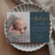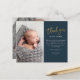 This modern photo thank you note features gold script thank you, personal message and a vertical photo on the front. The back includes a second baby photo that is a full bleed horizontal photo.