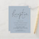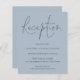 Budget Script Reception Details Dusty Blue Wedding Enclosure. A budget price SMALLER 4.5” x 5.6” alternative. Available in a SEMI GLOSS 110 lb CARD STOCK which is the default option (recommended for invitations), OR a SATIN FINISH 80 lb THINNER PAPER STOCK (ideal for enclosures). Envelopes are an optional extra and are slightly larger than the card size.  A modern set handwriting style script for the heading and the rest of the text you can easily personalise.
