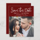 Budget Modern and Elegant Handwritten Script Square Photo Save the Date Wedding Card. The save the date invitation card includes a chic and stylish typography with a simple and minimalist design on a Burgundy background that you can add your customized engagement photograph picture to.