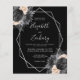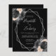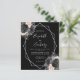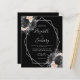 This elegant modern wedding invitation features a silver geometric frame decorated with peach, black and silver flowers on a black background. The customizable text combines silver grey whimsical handwriting, copperplate and italic fonts. The reverse side is solid black.