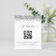 A value for money BUDGET alternative on a size 4.5 x 5.6” semi-gloss 110lbs weight, which is of similar thickness to a postcard (however is not suitable to use as a postcard.). PLEASE NOTE there is ONE invite per sheet. Budget Silver Glitter QR Code Wedding Details. A faux glitter border at the top on both sides with a stylish script with swashes for the header. Swap in your QR code to your wedding website for a convenient way for your guests to see all the details they need. To create a QR code, search online "generate a QR code"