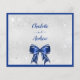 A faux silver metallic looking background, decorated with sparkling faux glitter dust. Decorated with royal blue frames and a bow on the back. Personalize and add the reply by date and your names.