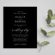 Elegant simple minimal moody dark budget affordable black wedding invitation template featuring a classy stylish chic trendy calligraphy script. ++++++++++++++++++++ Easy to personalize with your details! The invitation is suitable for formal black tie weddings. +++++++++++++++ NOTE that the background colour can be changed to match your wedding colour scheme. If comfortable doing it, you can change it after selecting CUSTOMIZE IT option. ++++++++++ PLEASE READ THIS BEFORE PURCHASING! This is a budget affordable wedding card printed on a paper sheet (each sheet has one card). ++++ For the best rapport price-quality, our advice is to choose the Semi-Gloss paper type (it is thick enough to be used for stationery) ++++ If you need envelopes, choose the ENVELOPE OPTION. +++ Double-check all the information and spelling of your text because you will receive exactly what you see - no one else will check anything before printing. ++++ This card is designed for size 4.5" x 5.6". In the case you choose another size of the card and text goes outside page, everything needs to be fixed before adding the product to cart. Please ask Live Design Service for help.