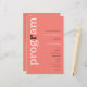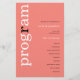 Simple Coral Rose Pink Text Wedding Program. A budget price size 5.5” x 8.5”, on an elegant 110 lb LINEN stock – for a luxury feel at great value, this is perfect for menus, as well as invitations and programs etc. This budget size alternative is also available in other paper choices. The SEMI-GLOSS 110 lb card stock is about the same thickness as a postcard, so also works well for invitations. The FELT 100 lbs paper is buff coloured, NOT white, so adds a rustic touch. The MATTE 80lbs paper stock is bright white, for crisp printing, great for your menus and programs, whilst the SATIN 80lbs paper is thin and light A modern typographical design with Program in large typography in white with the ”r” in black, rotated and to the left hand side on a background of coral rose pink.
