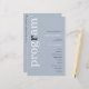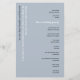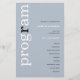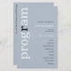 Simple Dusty Blue Text Wedding Program. A budget price size 5.5” x 8.5”, on an elegant 110 lb LINEN stock – for a luxury feel at great value, this is perfect for menus, as well as invitations and programs etc. This budget size alternative is also available in other paper choices. The SEMI-GLOSS 110 lb card stock is about the same thickness as a postcard, so also works well for invitations. The FELT 100 lbs paper is buff coloured, NOT white, so adds a rustic touch. The MATTE 80lbs paper stock is bright white, for crisp printing, great for your menus and programs, whilst the SATIN 80lbs paper is thin and light A modern typographical design with Program in large typography in white with the ”r” in black, rotated and to the left hand side on a background of pale dusty blue.