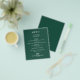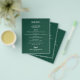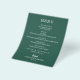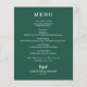 An emerald green dinner menu features your food choices in chic white lettering. Perfect for a modern wedding reception, wedding rehearsal dinner, anniversary party or any special event with a sit down dinner. An excellent value, printed on thinner 80lb weight uncoated matte white paper measuring 4.5" x 5.6", but you can choose from 3 paper sizes for your menu. For thicker menus (same design) please visit our store.