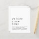 Simple Moving New Home Details. A budget friendly SMALLER 4.5” x 5.6” alternative to advise your new address. Available in a SEMI GLOSS 110 lb CARD STOCK or a SATIN FINISH 80 lb THINNER PAPER STOCK. Envelopes are an optional extra. The header is large in stylish lowercase with the details beneath. Lots of white space at the top for a contemporary feel! Easily personalise the text to your own details.