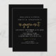 Simple Script Gold Black Engagement Invite. A budget price SMALLER 4.5” x 5.6” alternative. Available in a SEMI GLOSS 110 lb CARD STOCK which is the default option (recommended for invitations), OR a SATIN FINISH 80 lb THINNER PAPER STOCK (ideal for enclosures). Envelopes are an optional extra and are slightly larger than the card size. Modern minimalism in classic black with gold and white typography. Engagement is set in a modern handwriting style. Easily personalise the rest of the text to your own.