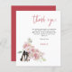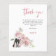 Stiletto Pink Florals Hen Party Thank You. A budget price SMALLER 4.5” x 5.6” alternative. Available in a SEMI GLOSS 110 lb CARD STOCK which is the default option (recommended for invitations), OR a SATIN FINISH 80 lb THINNER PAPER STOCK (ideal for enclosures). Envelopes are an optional extra and are slightly larger than the card size. A motif of an elegant pair of black stiletto shoes partially hidden by pink florals with the text set to the right, and white space for a contemporary touch. The main header Hen Party is in a set script typography and the rest of the text you can easily personalise. On the back, a coordinating shade which you can change to another colour if you wish via customise further.