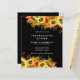 Sunflower Berry Thanksgiving Dinner Black Invite. A budget price SMALLER 4.5” x 5.6” alternative. Available in a SEMI-GLOSS 110 lb CARD STOCK which is the default option (thicker for invitations), OR a SATIN FINISH 80 lb THINNER PAPER STOCK (ideal for enclosures). Envelopes are an optional extra and are slightly larger than the card size. A beautiful wildflowers floral design in autumn colours to invite your friends and family to your Thanksgiving Dinner party. The sumptious botanicals decorate the top and bottom, and easily personalise the the text which is in white against a classic black background.