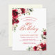 Red roses and blush pink peonies are nestled in dark green leaves on this beautiful and unique birthday invitation.