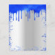 A faux silver looking background. Decorated with royal blue faux glitter drips paint dripping look, sparkles and balloons. Personalize and add a name and party details. The name is written with a hand lettered style script.