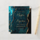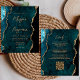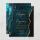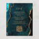 This elegant wedding invitation features a background image of teal blue watercolor agate trimmed with faux gold glitter. The customizable text combines gold-coloured modern handwriting, copperplate and italic fonts. The reverse side provides space for wedding details on a matching teal agate background, along with a QR code guests can scan to visit your website and RSVP, which saves the cost of printing and mailing separate RSVP cards.