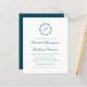 This elegant wedding invitation design features a teal blue script monogram initial encircled by a line art botanical wreath. The names appear in teal script, with the rest of the text in classic serif font. The reverse side provides space for wedding details on a solid teal blue background, along with a QR code guests can scan to visit your website and RSVP.