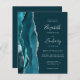 The left-hand edge of this elegant modern wedding invitation features a teal blue watercolor agate border trimmed with faux silver glitter. The customizable text combines handwriting, copperplate and italic fonts in silver grey on a dark teal background. The reverse side provides space for wedding details on a solid teal background, along with a QR code guests can scan to visit your website and RSVP, which saves the cost of printing and mailing separate RSVP cards.