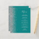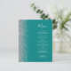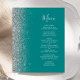The left-hand edge of this elegant modern wedding menu features a silver faux glitter border. The customizable text combines silver grey handwriting script and copperplate fonts on a teal blue background. The reverse side features a matching teal and silver design.