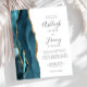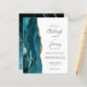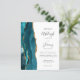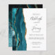 The left-hand edge of this elegant modern wedding invitation features a teal watercolor agate border trimmed with faux gold glitter. The customizable text combines handwriting, copperplate and italic fonts in charcoal gray on a white background. The reverse side features a matching teal and gold agate design.