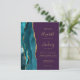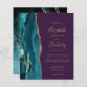 The left-hand edge of this elegant modern wedding invitation features a teal watercolor agate border trimmed with faux gold glitter. The customizable text combines gold-coloured handwriting, copperplate and italic fonts on an opulent deep purple background. The reverse side features a matching teal and gold agate design.