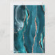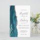 The left-hand edge of this elegant modern wedding invitation features a teal watercolor agate border trimmed with faux rose gold glitter. The customizable text combines handwriting, copperplate and italic fonts in charcoal gray on a white background. The reverse side features a matching teal and rose gold agate design.