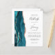 Save the cost of printing and mailing separate RSVP cards with this elegant modern all-in-one budget wedding invitation. The left-hand edge features a teal blue watercolor agate border trimmed with rose gold faux glitter. The customizable text combines charcoal gray handwriting, copperplate and italic fonts on a white background. The reverse side provides space for wedding details, along with a QR code guests can scan to visit your website and RSVP.
